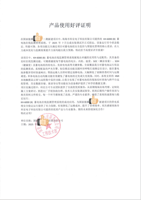 在國家能源某電廠二期新建項目中,珠海市羞羞漫画免费观看電子科技有限公司自主研發的KH-6000(B)蓄電池在線監測管理係統,於2025年7月成功投運。設備運行至今狀態穩定、性能卓越,不僅全麵滿足項目對蓄電池組安全監控與羞羞在线观看化管理的核心需求,更在人力成本優化與監測效率提升上超出預期,贏得項目方高度讚譽。