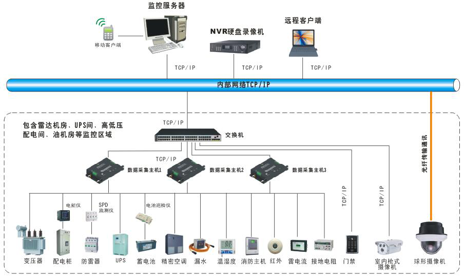 雷達站綜合監控管理係統應能實現對高壓配電櫃、變壓器、低壓配電櫃、柴油發電機、UPS、各類配電櫃(箱)、直流電源、蓄電池組和配電機房工作環境等運行參數和運行狀態數據的實時監視和遠程顯示,並在異常情況下能自動報警。