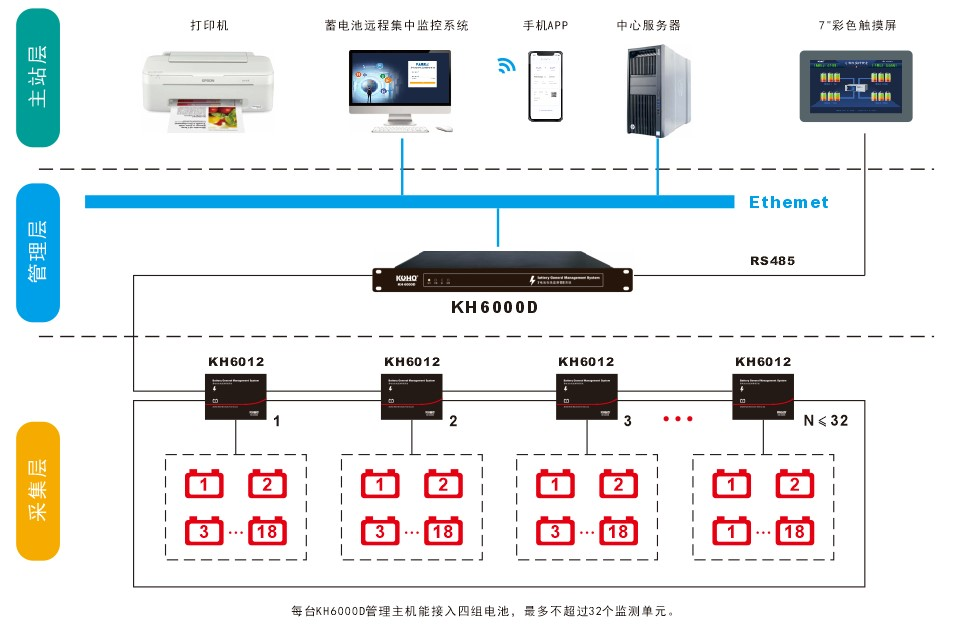 KH6000D蓄電池在線監測管理係統由管理主機、監測單元、7”彩色觸摸屏三部份組成,用戶可根據具體需求及結合現場安裝情況加以選擇。