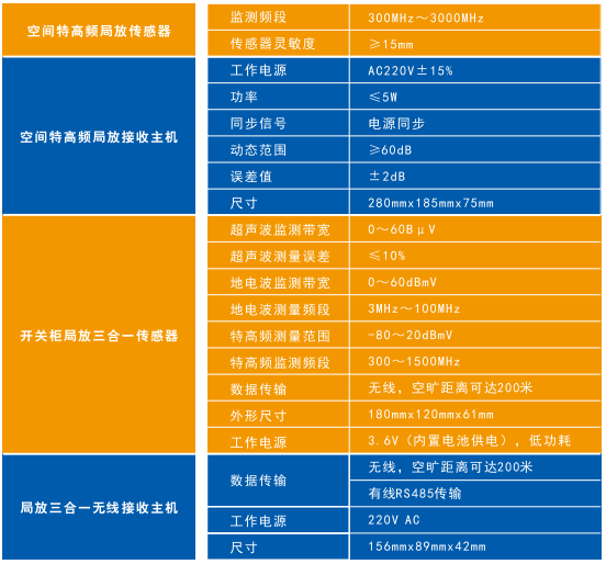 產品由空間特高頻局放傳感器、空間特高頻局放接收主機、開關櫃局放三合一傳感器、局放三合一無線接收主機四部分構成。
